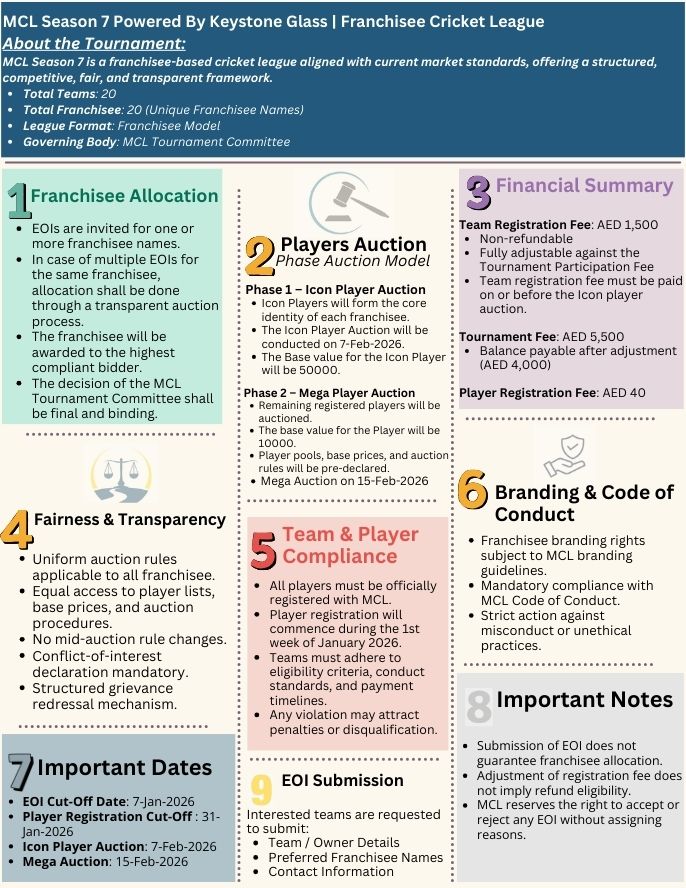 TEAM REGISTRATION RULE FOR KEYSTONE SMART GLASS MCL 2026 Twenty Teams will Be Available For MCL-2026The Auctioneer Must Select Their Preferred Team From The MCL-2026 Team List.All Team Owners Should Be Available at the Time Of Auction.If More Auctioneers Are Prefer to Have Same Team Then It will go for Auction to Decide the Team Owner.If There Is Only One Bid For A Team, Then The Owner Ship of That Team Will Be Granted To That Auctioneer For Its Base Value.If any Auctioneer Were Unable To Buy his First Preferred Team Can Join For The Auction Of Other Teams Which Are Unsold.The Final Fixture Publishes By MCL-2026 Won’t Be Altered At Any Cost.Each And Every Team Management Should Strictly Follow Current Covid Protocols.It Is The Responsibility Of The Team Owners And Their Management To Maintain A Fair Play, Through Out The Tournament.Team Jersey Will Be Provided By MCL-2026Players Will Not Be Allowed To Play In Any Other Team Jerseys Expression of interest (eoi)